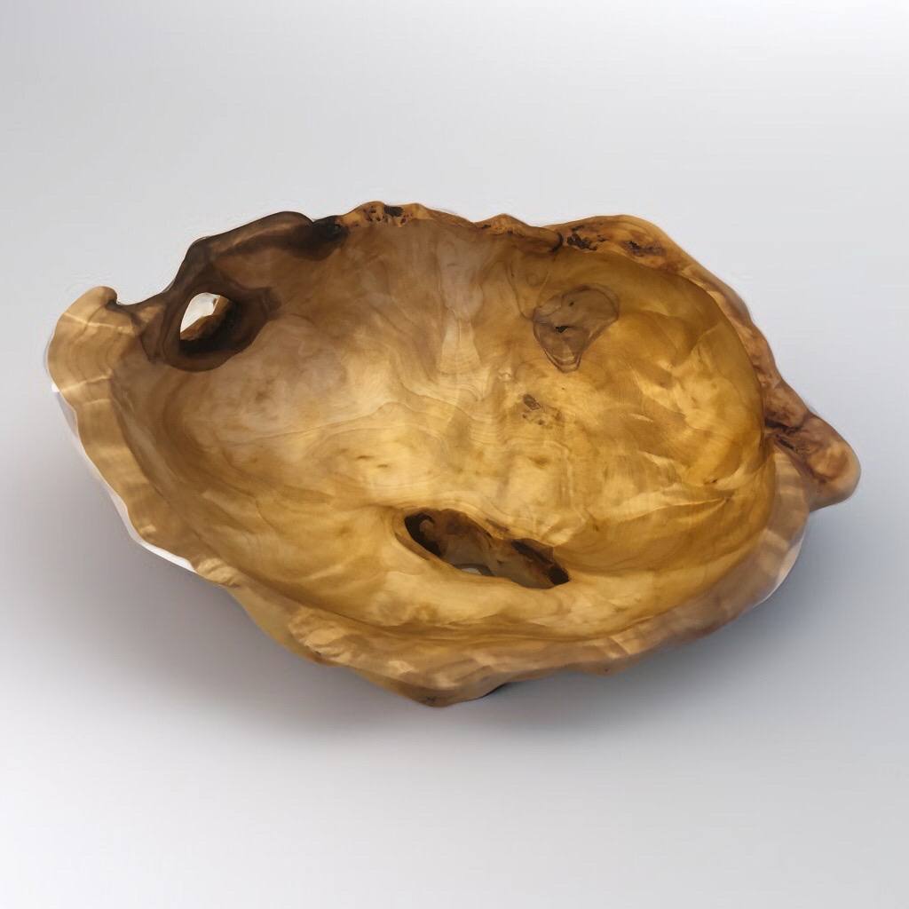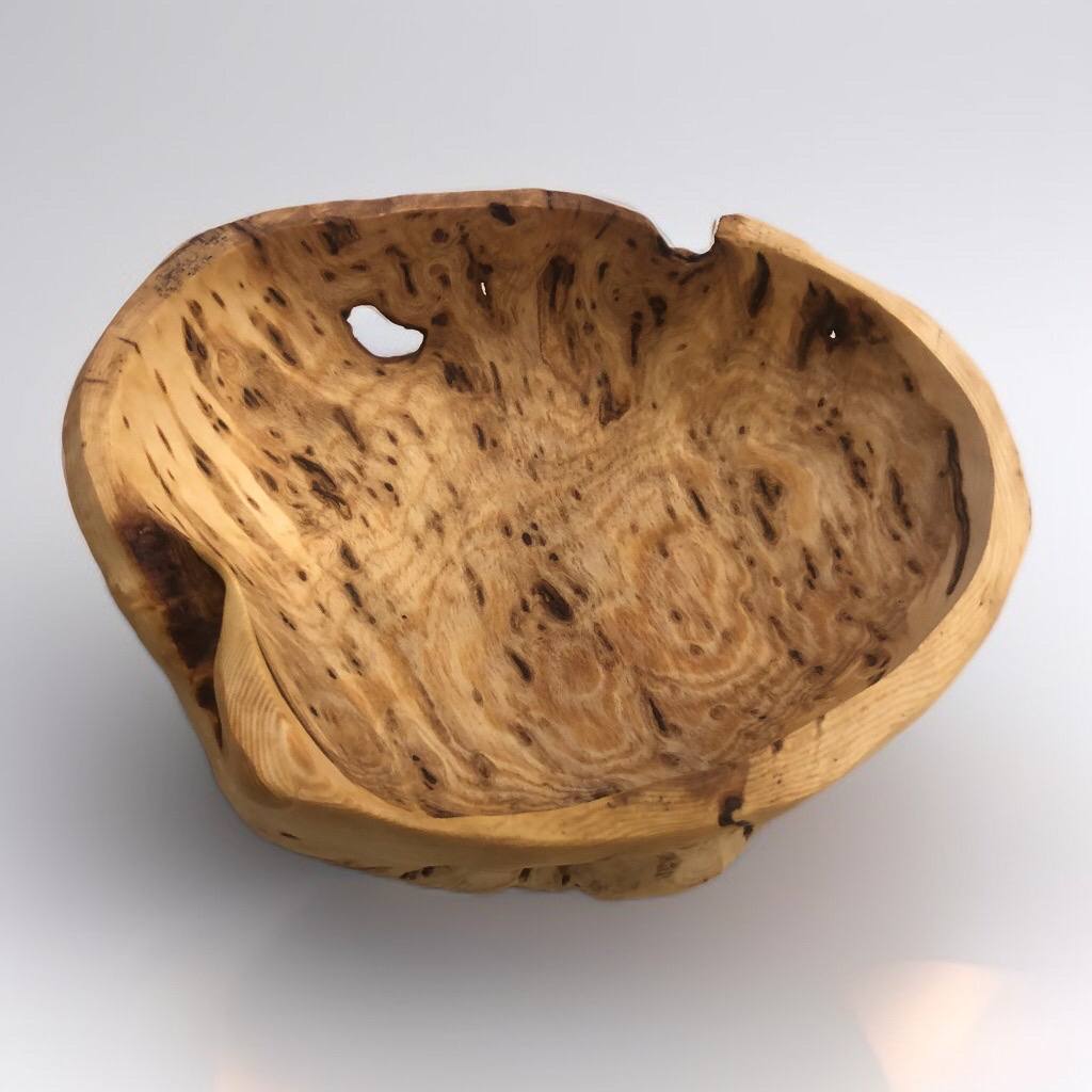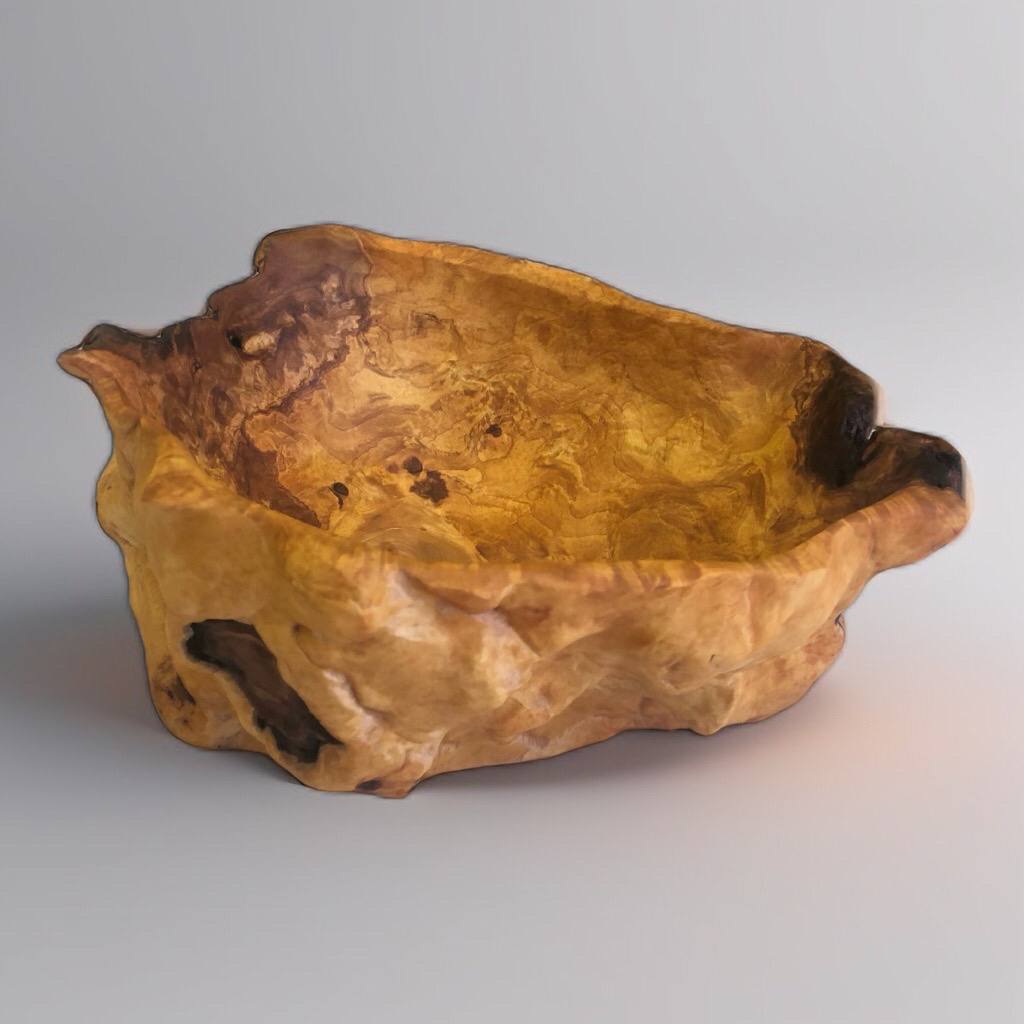 Первая чаша в коллекции из сувеля сосны. Отличается тёплым, медово-янтарным цветом и мягким волнистым рисунком. Сохранился лёгкий, натуральный хвойный аромат.