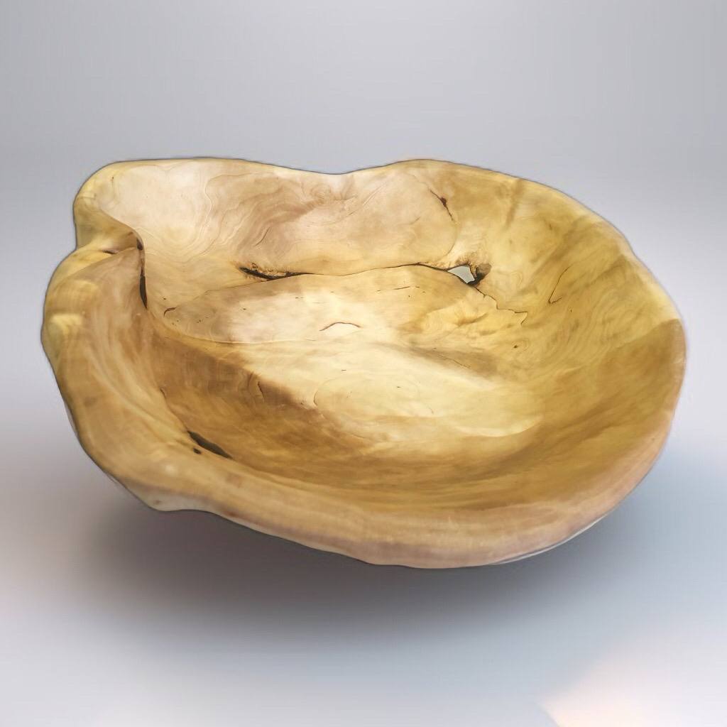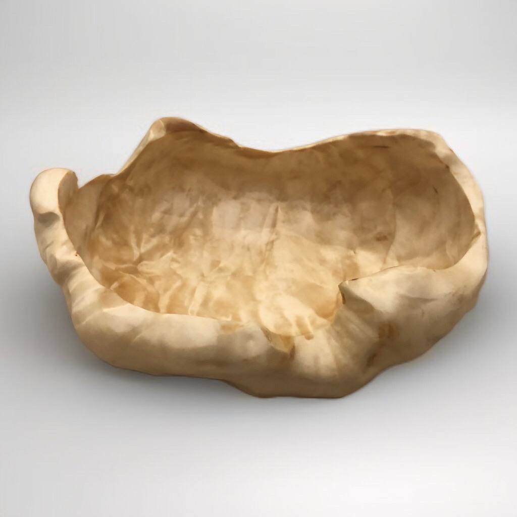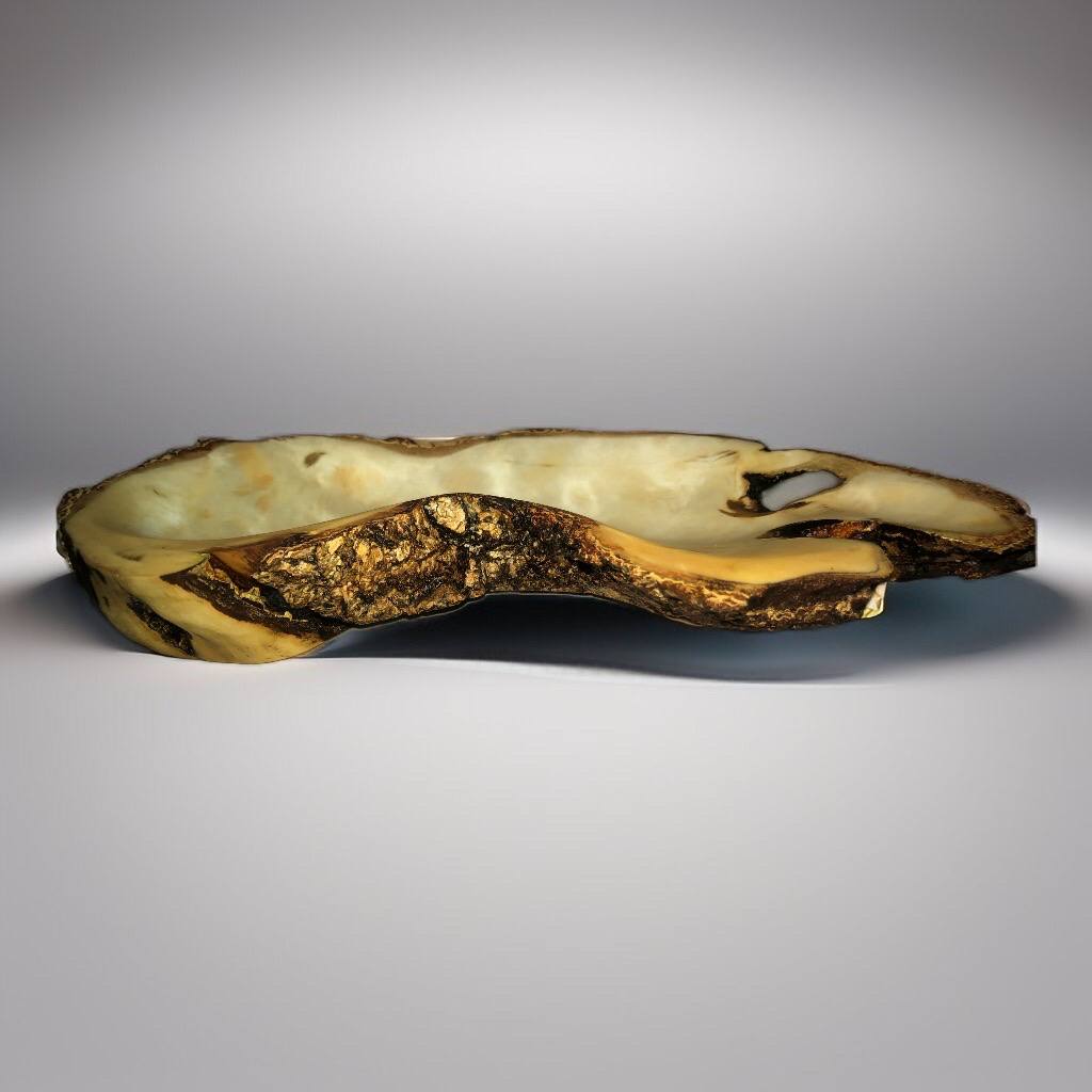 Первая чаша в коллекции из сувеля сосны. Отличается тёплым, медово-янтарным цветом и мягким волнистым рисунком. Сохранился лёгкий, натуральный хвойный аромат.