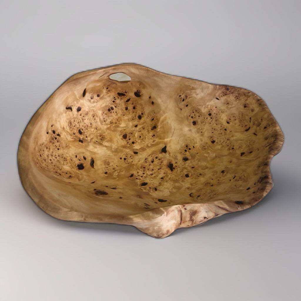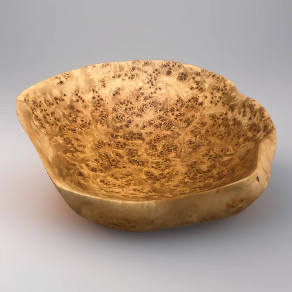 Чаша, демонстрирующая классическую и редкую текстуру капа. Множество мелких, переливающихся ячеек напоминают пчелиные соты. Плотная, твёрдая древесина обработана с ювелирной точностью.