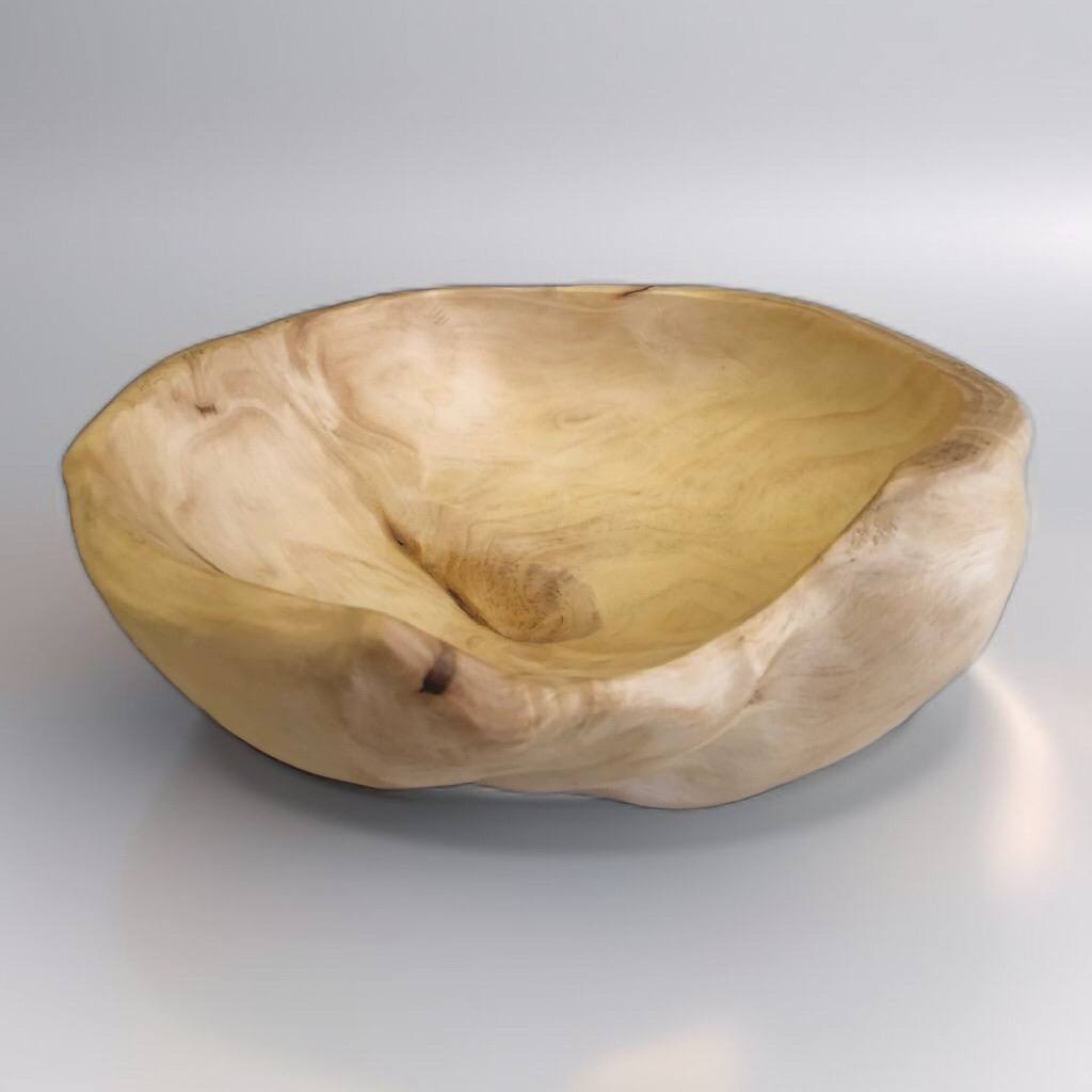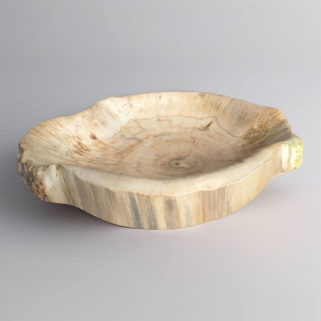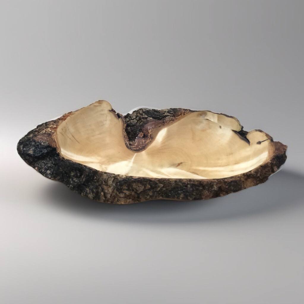 Кора сохранена почти по всему внешнему периметру, создавая ощущение цельного спила. Внутри — гладкая, тёплая поверхность с мягким рисунком. Чаша устойчива и самодостаточна.