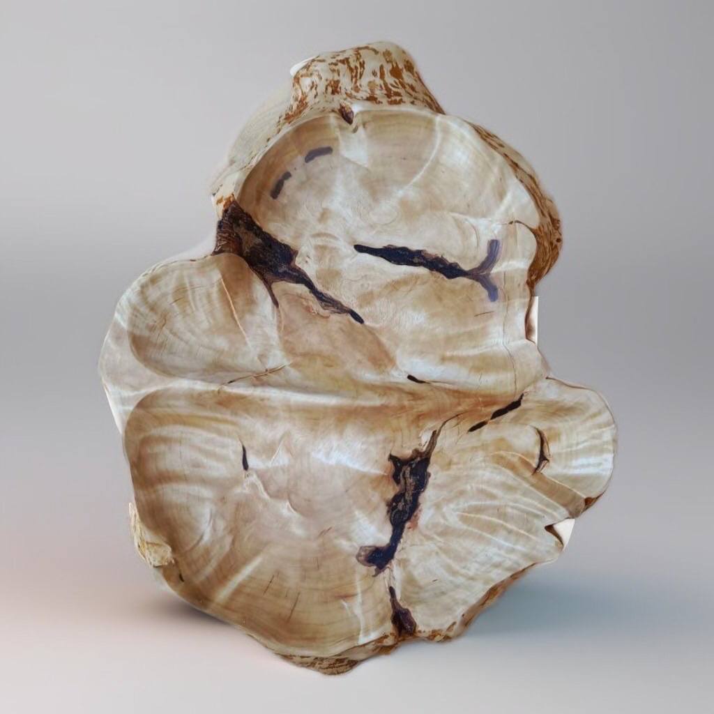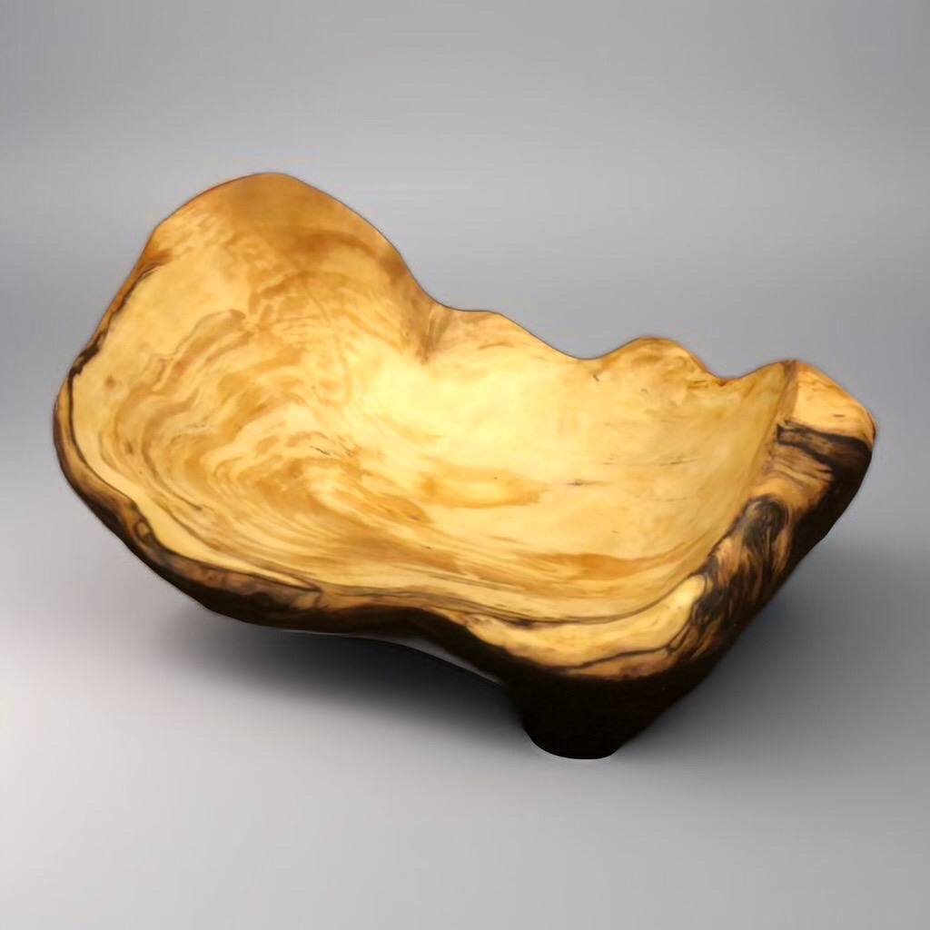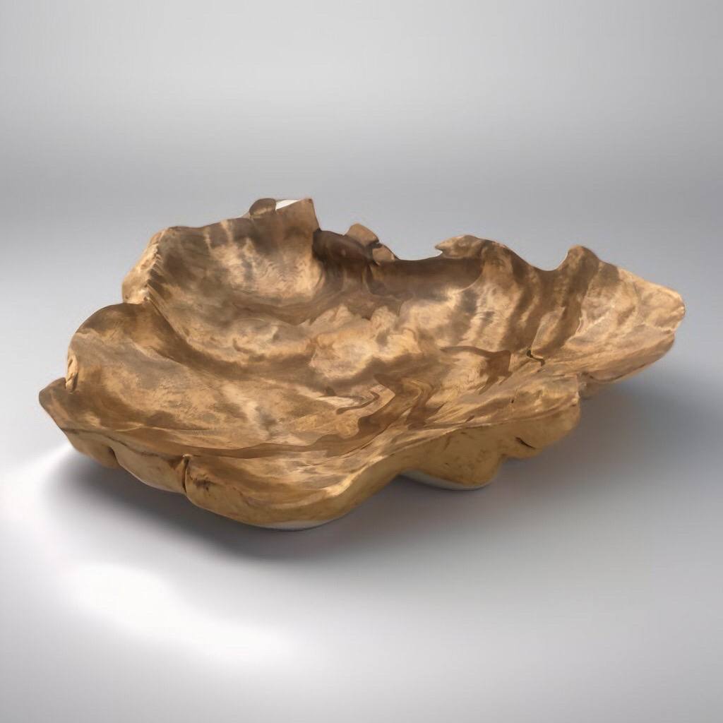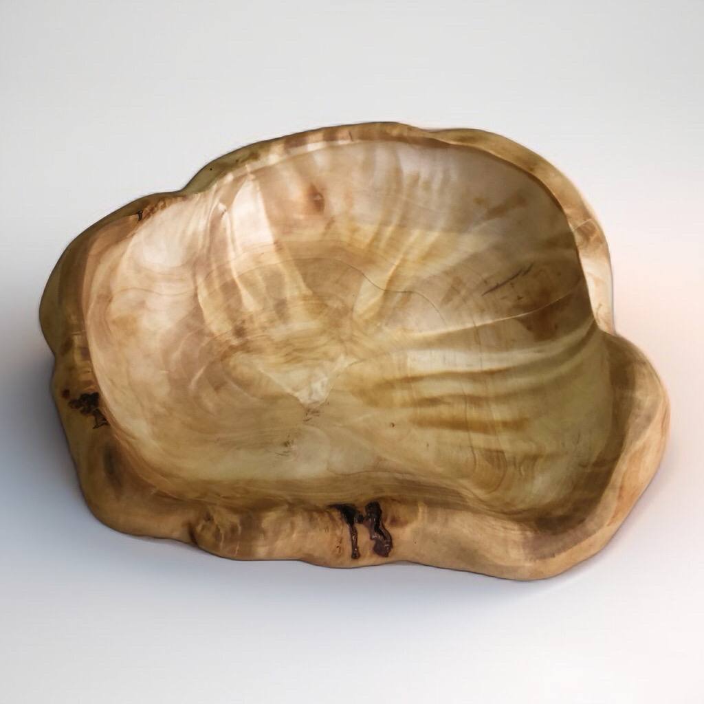Кора сохранена почти по всему внешнему периметру, создавая ощущение цельного спила. Внутри — гладкая, тёплая поверхность с мягким рисунком. Чаша устойчива и самодостаточна.