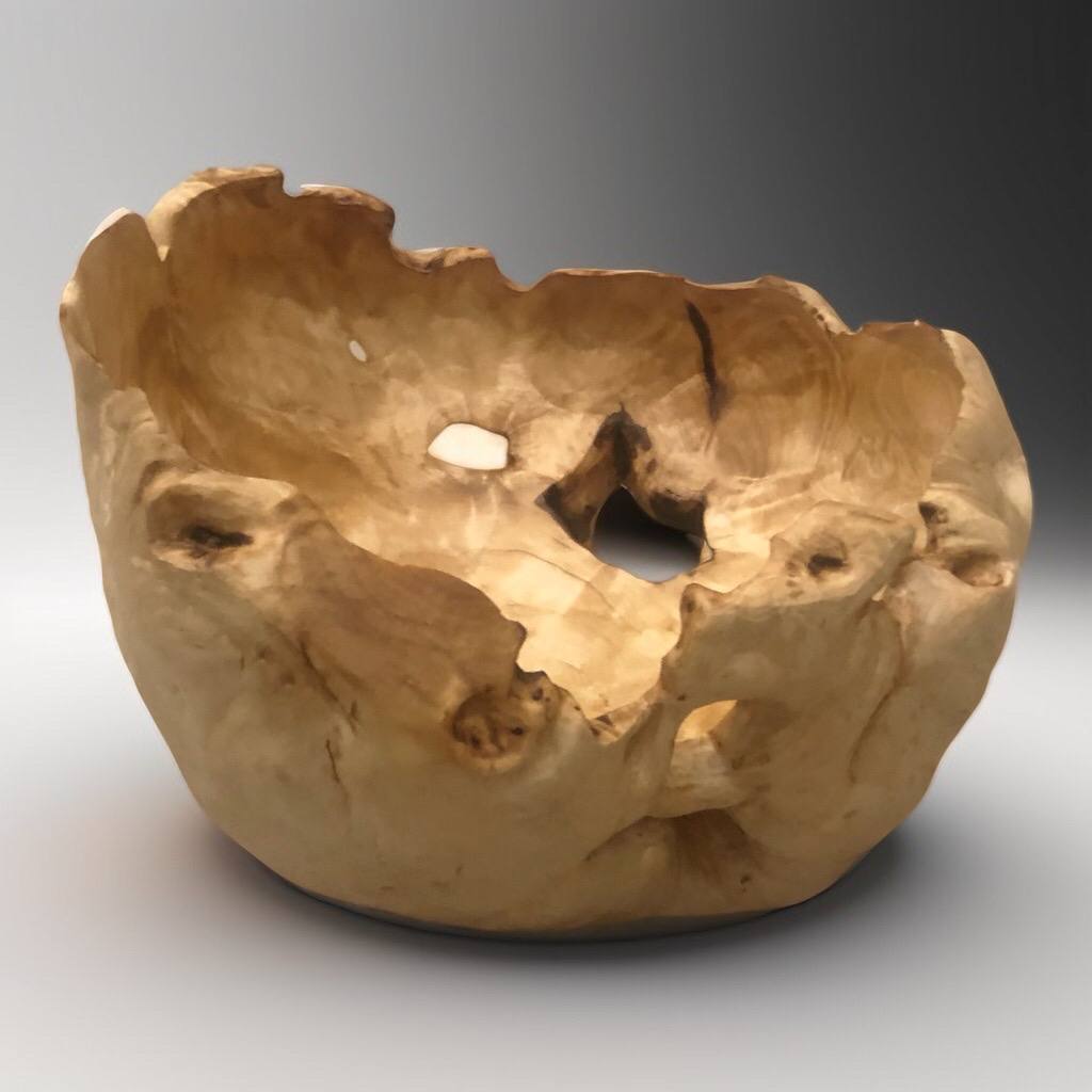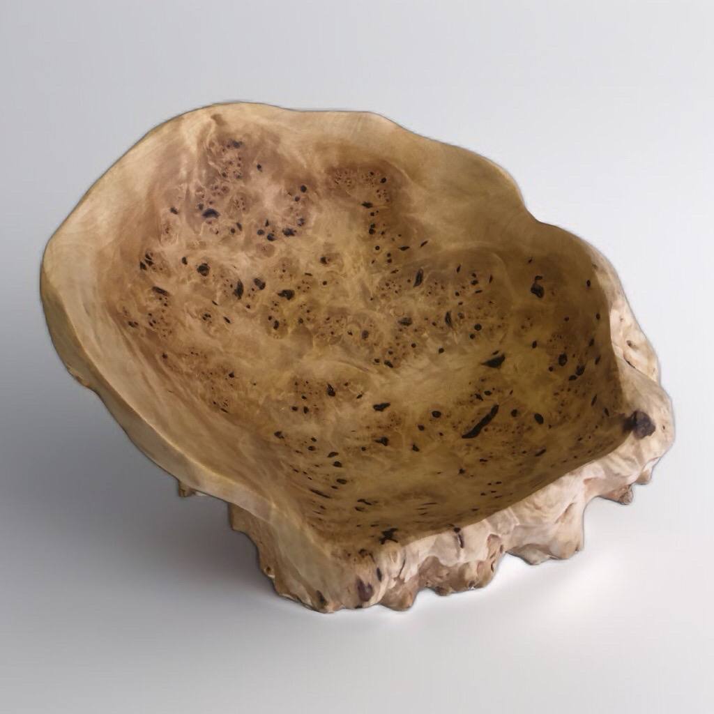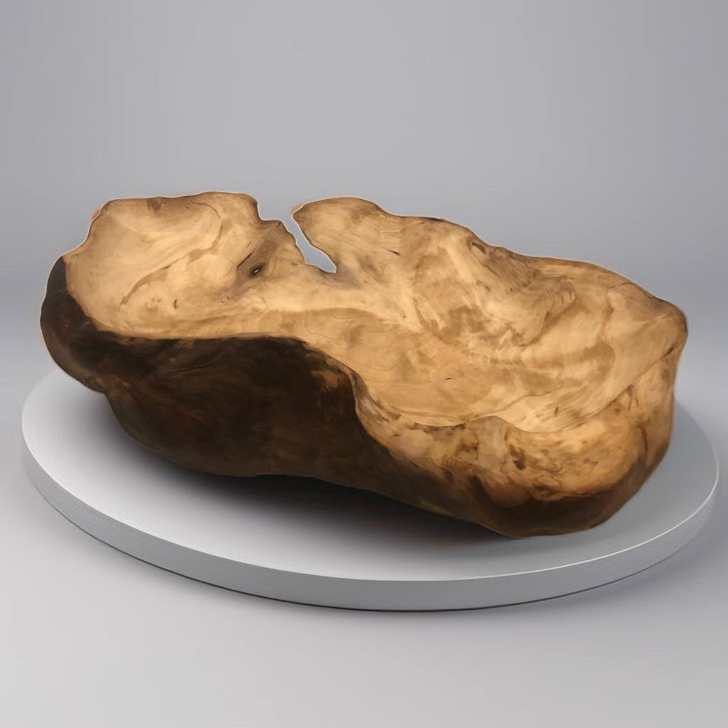 Солидная глубокая чаша из редкого капа. Её сложная, пузырчатая текстура с множеством «глазков» подобна кристаллу или застывшей пене. Центр коллекции.