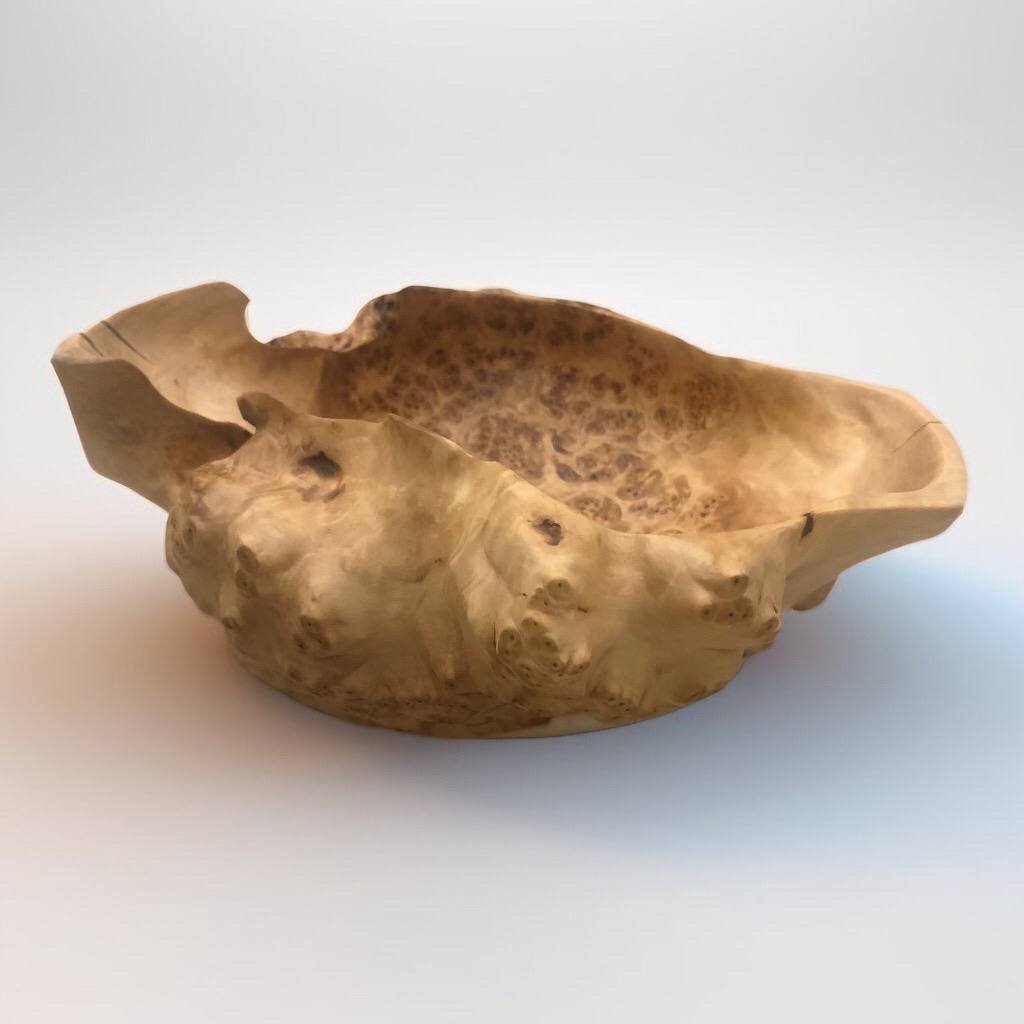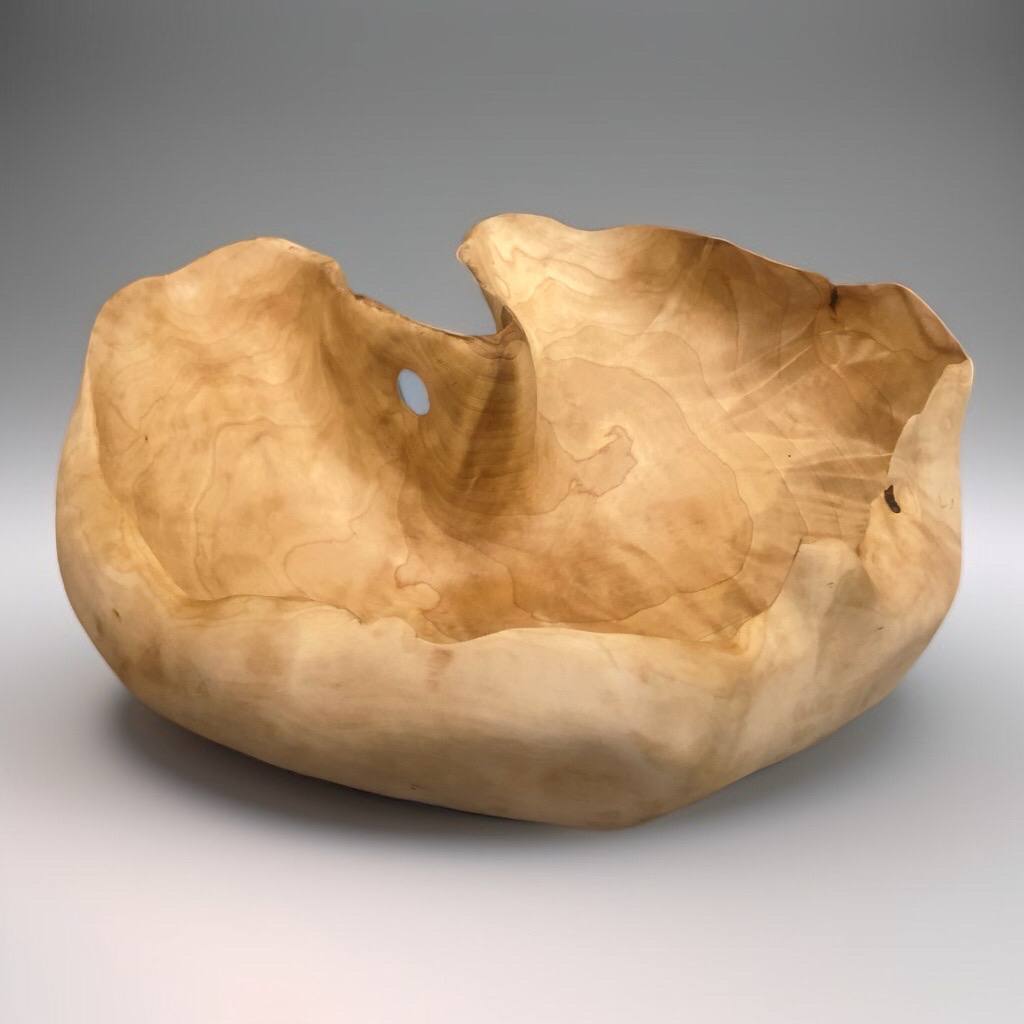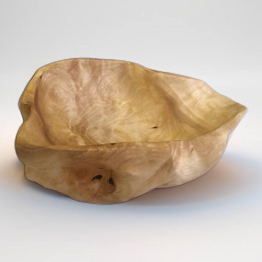 Чаша из цельного сувеля березы, где естественное отверстие от ветки сформировало выразительный выступ-ручку. Скульптурная, монументальная форма раскрывает рисунок дерева. Уникальный экземпляр.